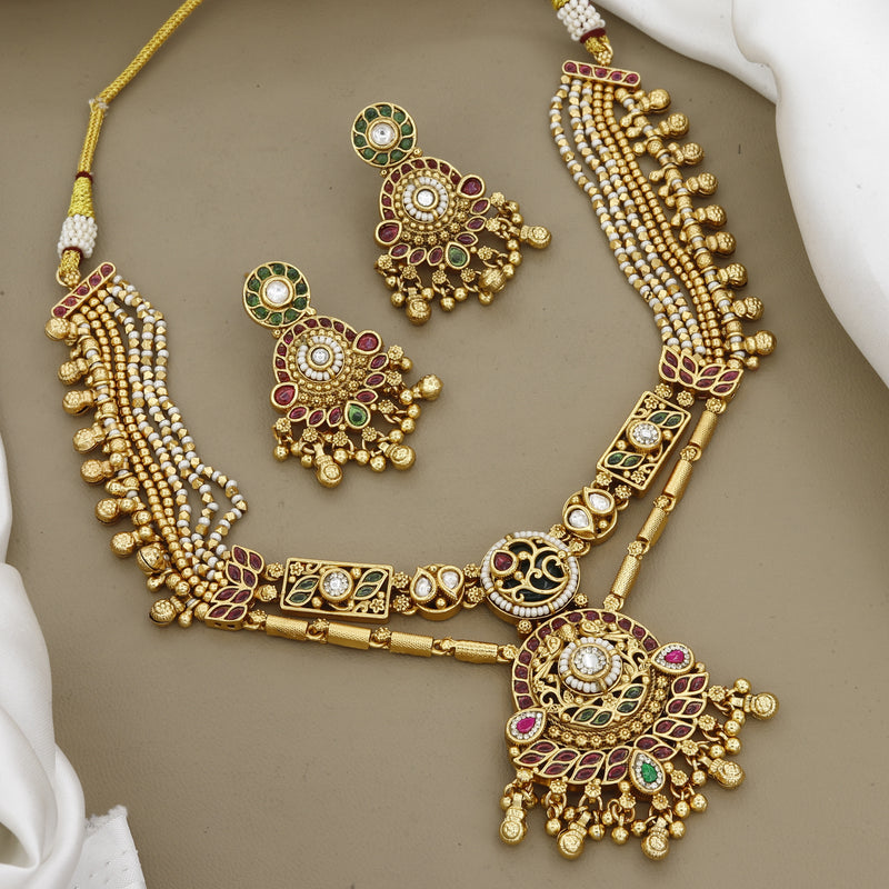 Antique Gold-Plated Matar Mala Bracelet with Ruby & Emerald Centerpiece