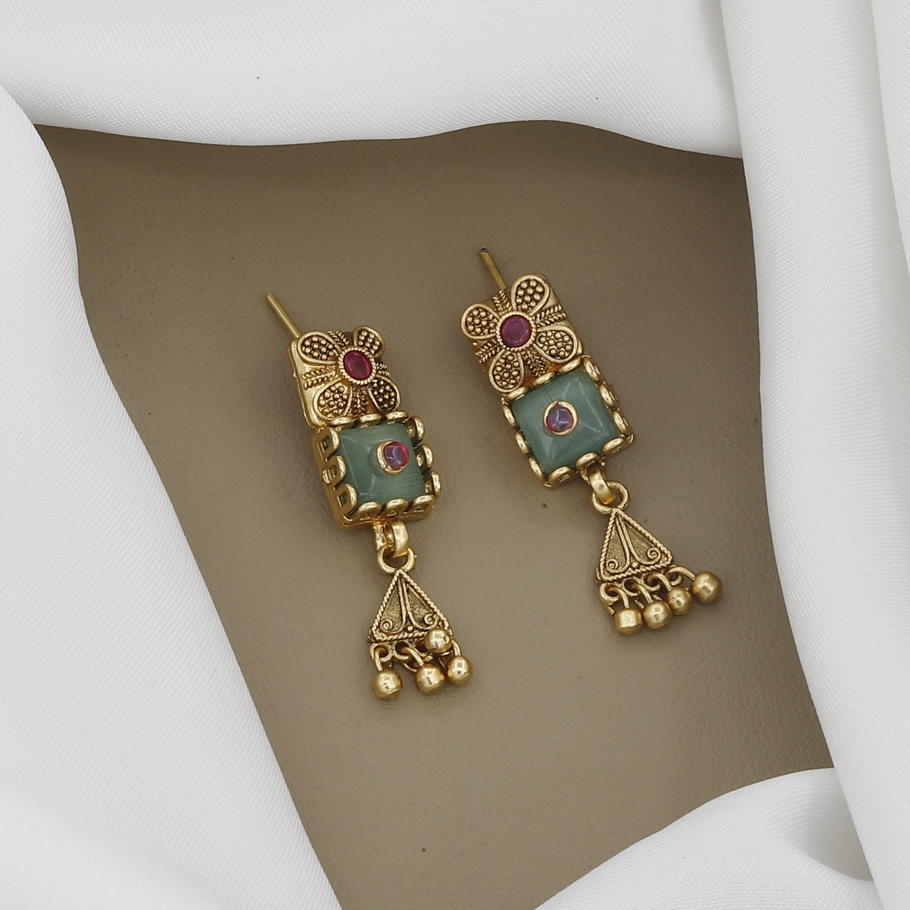 iscover this beautifully crafted Antique Gold Charm & Pearl Beaded Necklace Set. Its delicate design and vibrant beadwork make it a subtle yet stunning accessory. Ideal for festive wear!