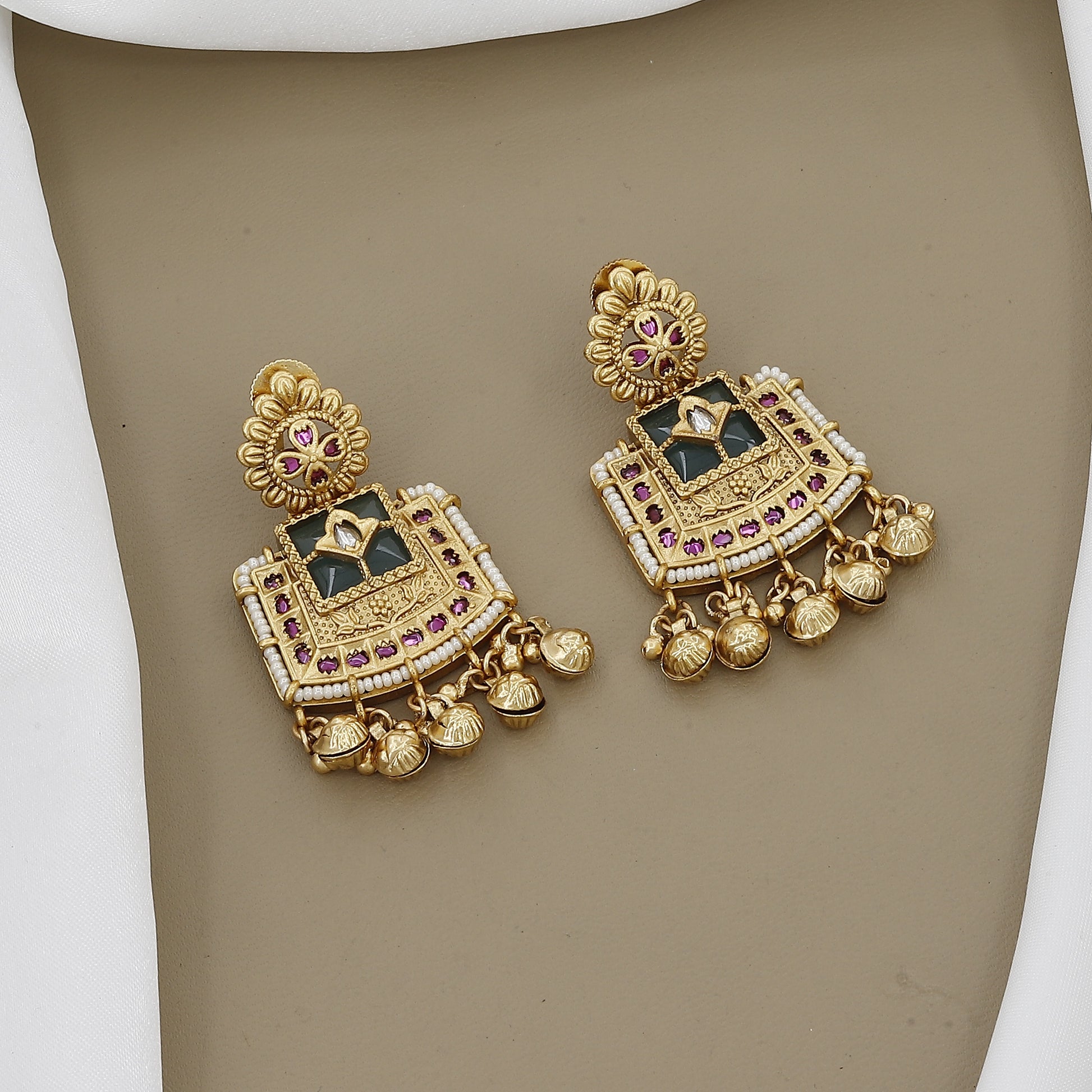 Adorn yourself with this elegant antique choker set, featuring intricate gold plating, beautiful pearl strands, and matching jhumka earrings. This piece is perfect for making a statement at weddings, parties, and festive occasions.