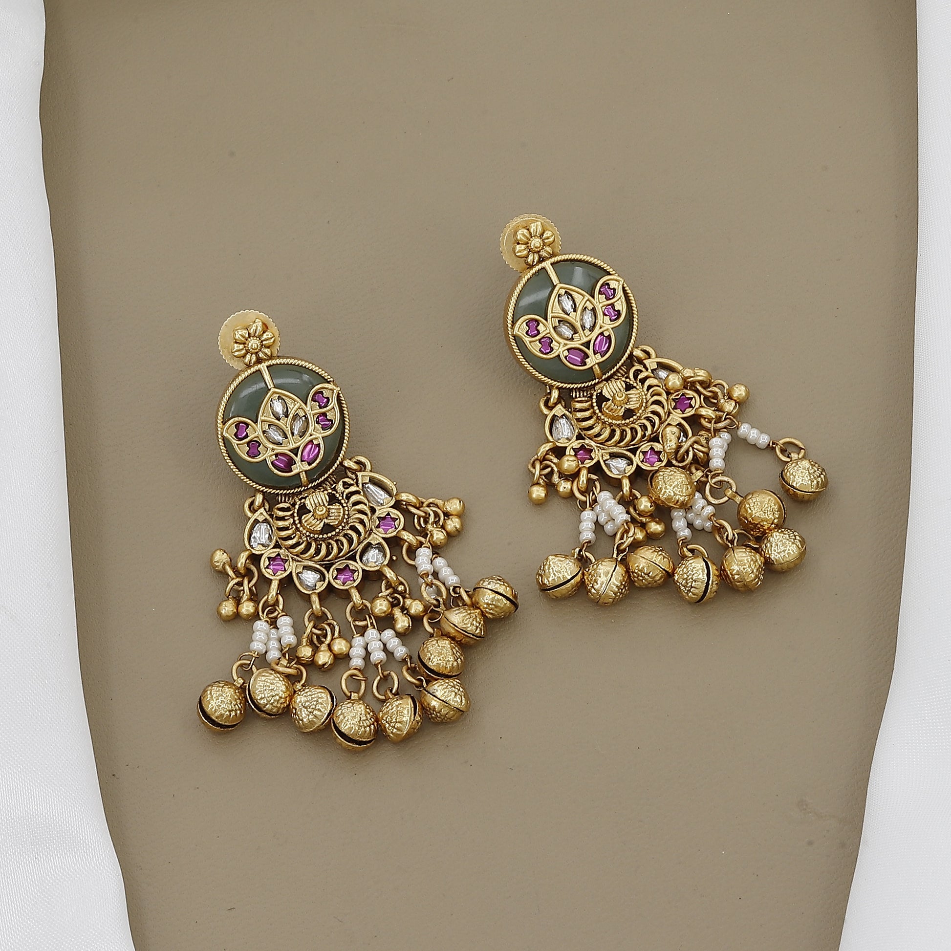 Adorn yourself with this elegant antique choker set. Featuring a stunning gold-plated design with vibrant ruby and green stones, this piece is beautifully accented by a side-swept pearl strand and dangling jhumka earrings. Perfect for weddings and festive occasions.