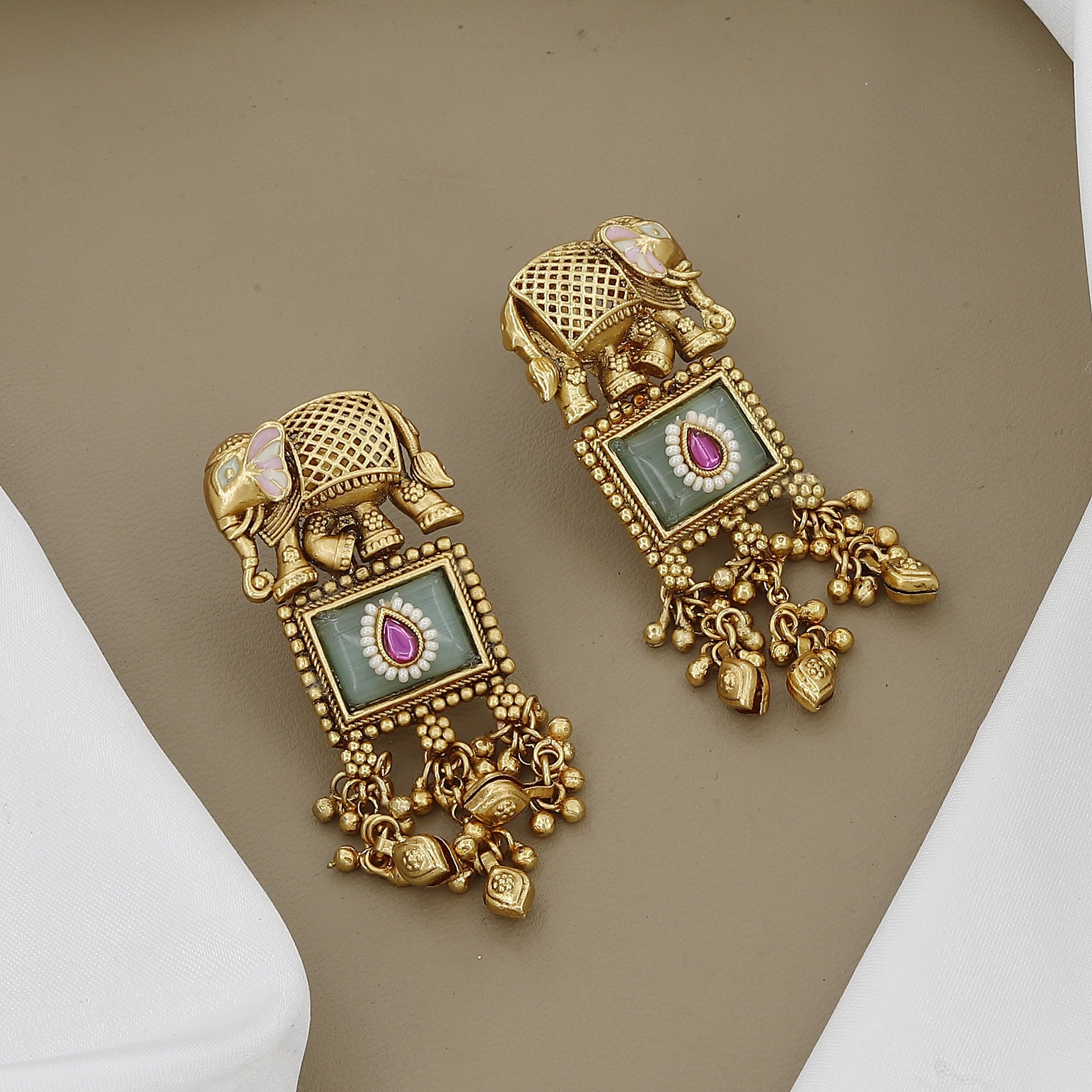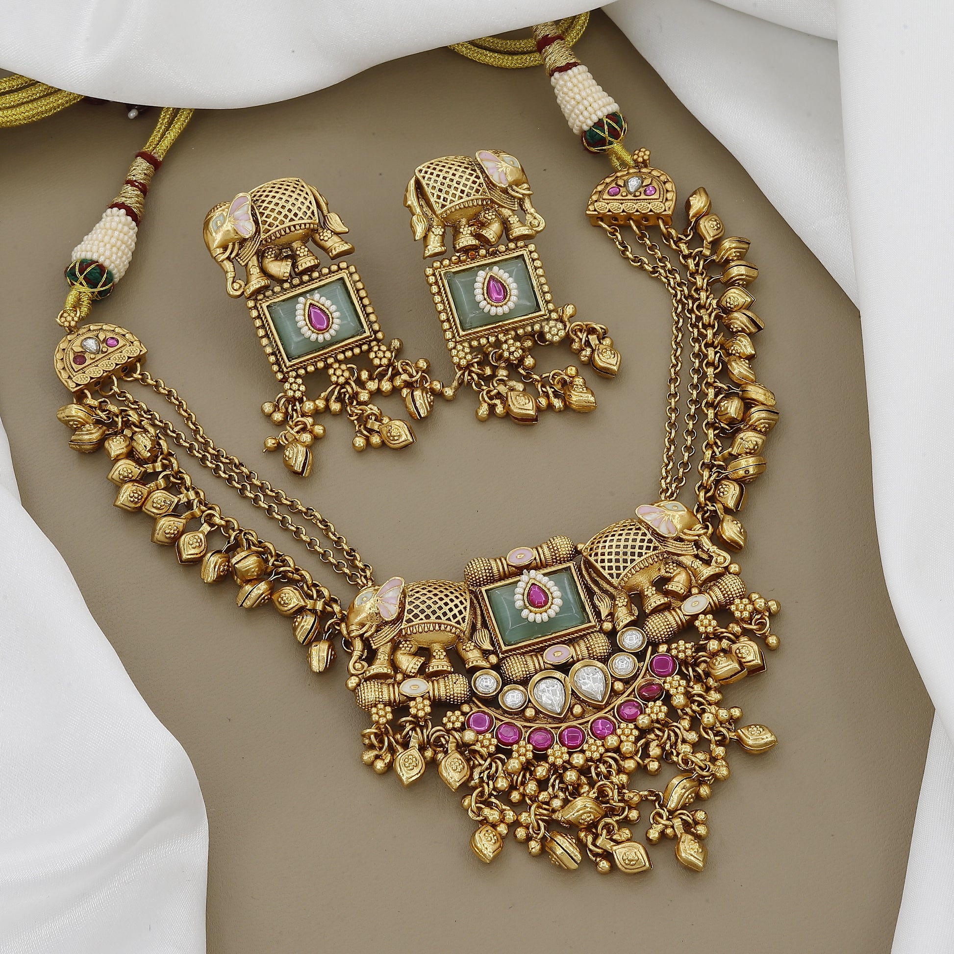 Discover this majestic antique gold-toned necklace set featuring a unique elephant motif. The handcrafted design with intricate detailing and a matte finish creates a stunning statement piece, perfect for weddings and festive occasions.