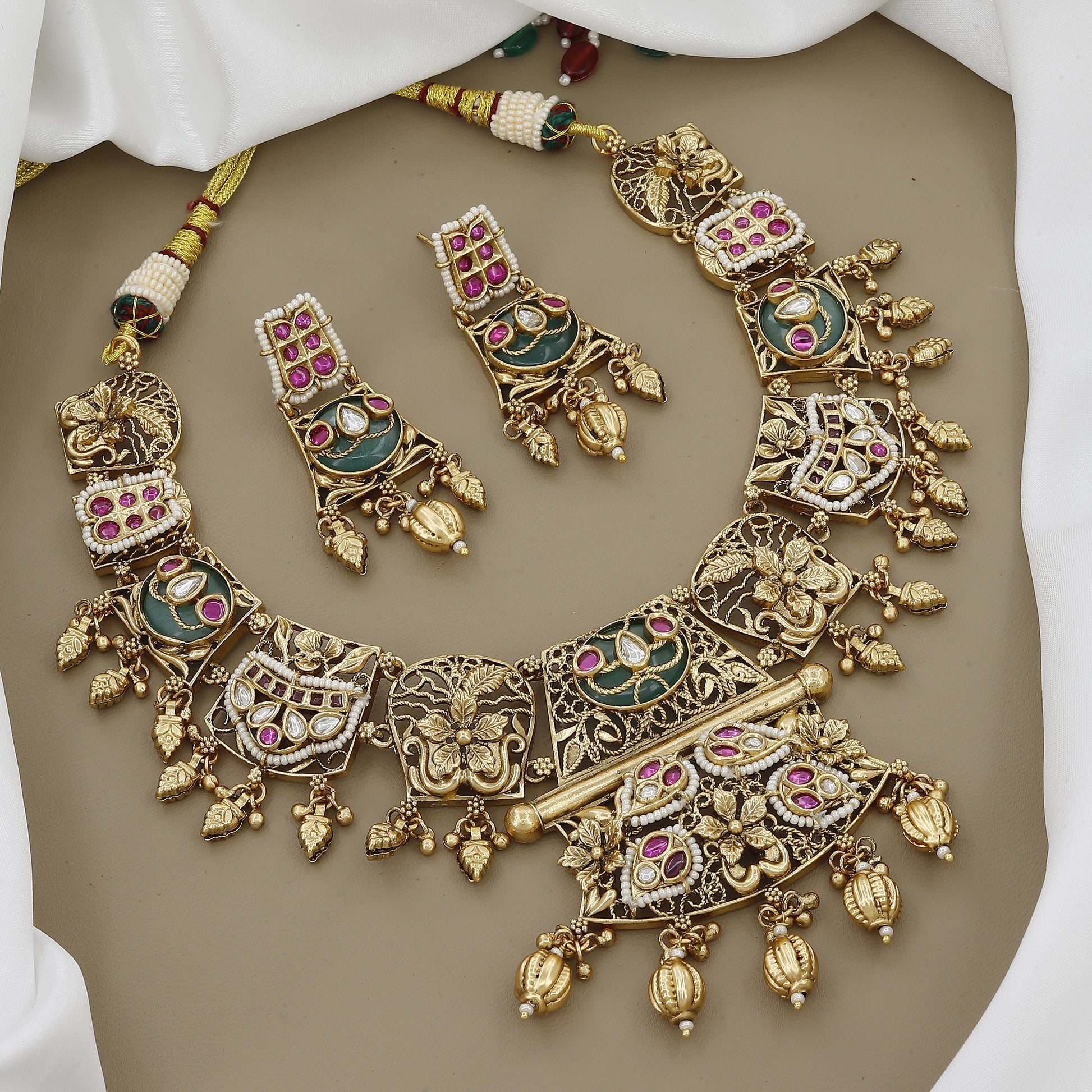 Elevate your look with this stunning antique choker necklace and earring set. It features intricate kundan and meenakari work on a classic gold-toned design, perfect for weddings and festive occasions.