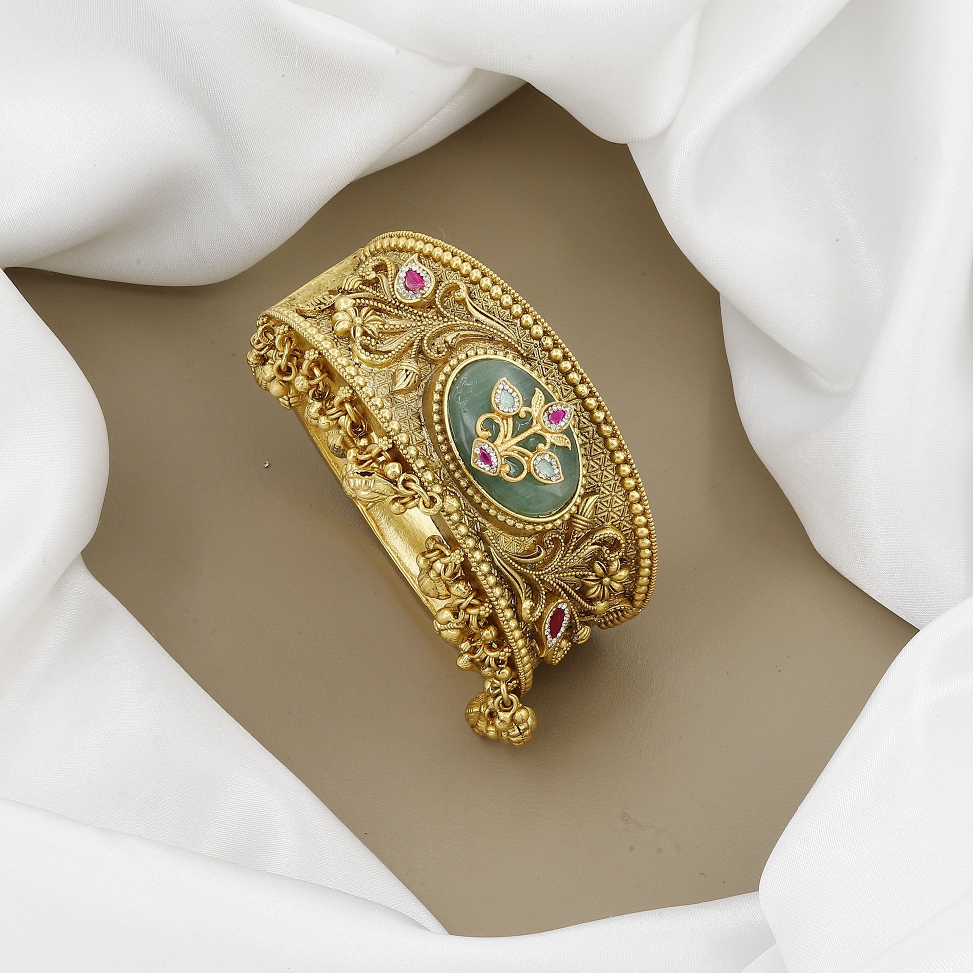 Make a spectacular statement with this dramatic, extra-wide gold-tone cuff. It features intricate filigree and floral carvings, centered by a carved green stone embellished with ruby-red accents. Finished with dangling gold bead drops for a rich, traditional look.