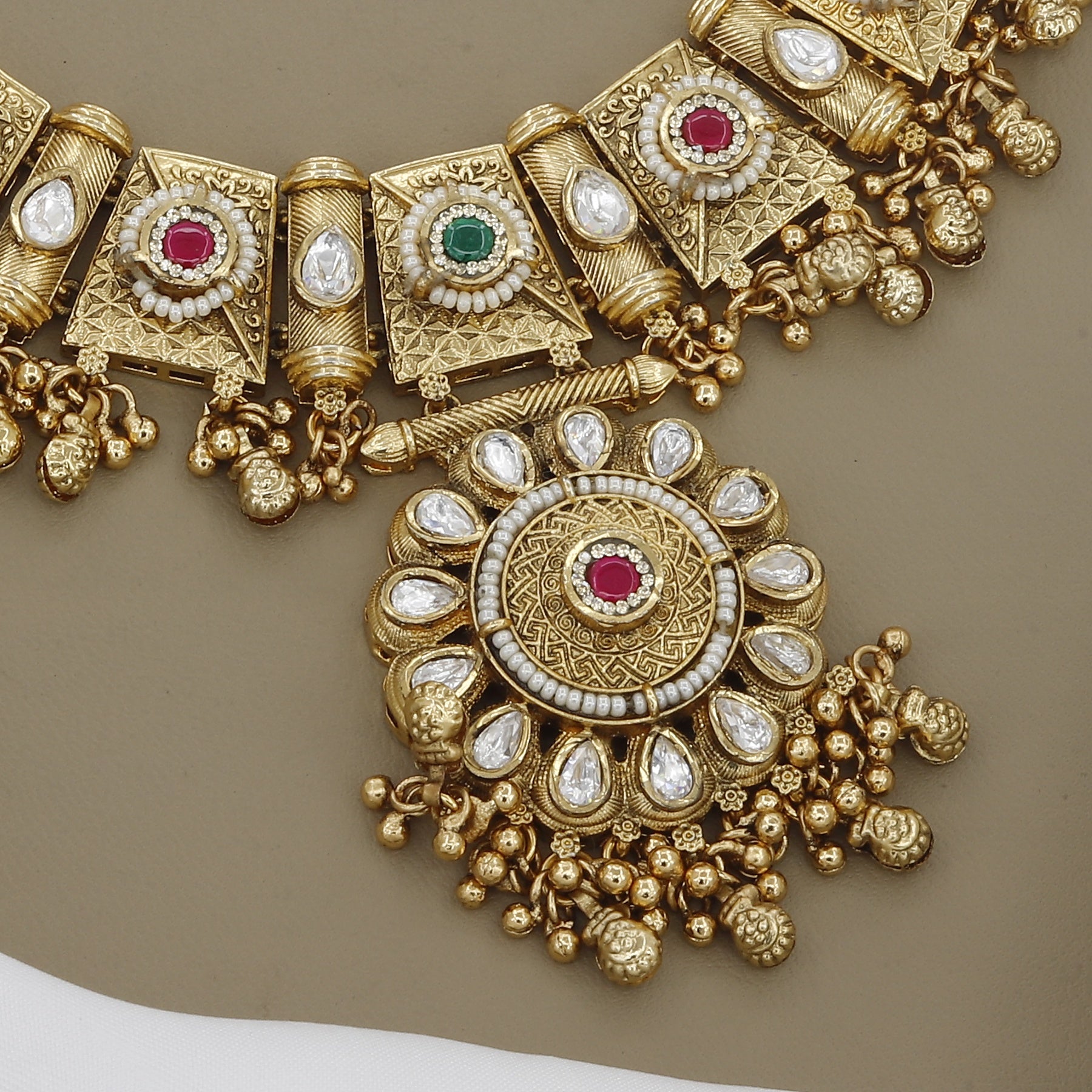 Elevate your ethnic look with this antique gold temple necklace set featuring intricate Kundan detailing, pearls, and matching statement earrings. A perfect pick for weddings, festive occasions, and bridal wear.