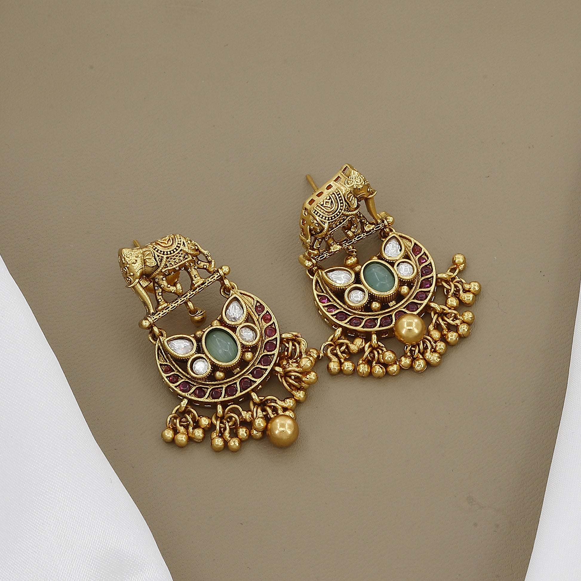 Discover this majestic antique gold-toned necklace set featuring exquisite peacock and elephant motifs. The handcrafted design with kundan stones and a matte finish creates a stunning statement piece perfect for weddings and festive occasions.