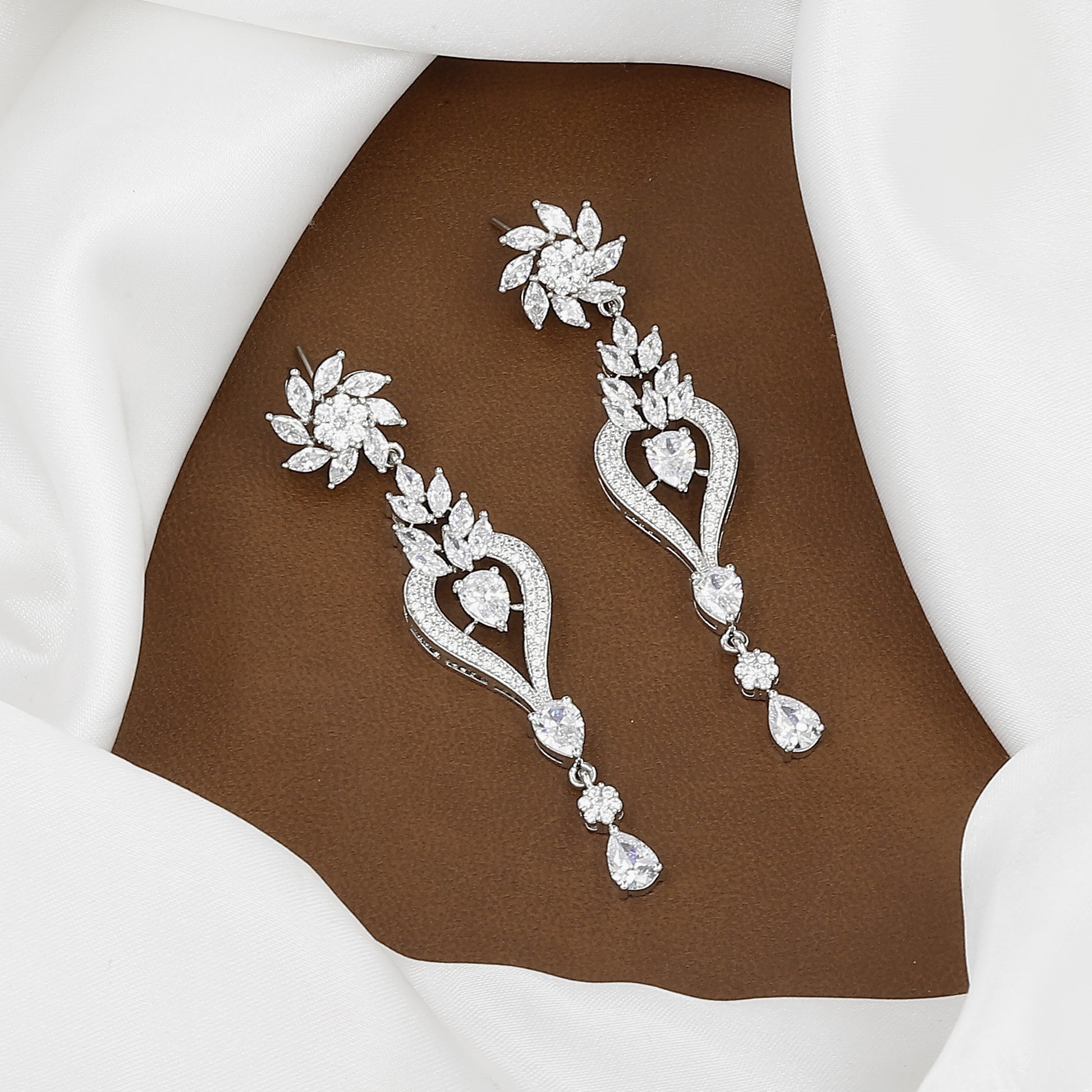Elegant Silver-Tone CZ Y-Necklace and Drop Earring Set