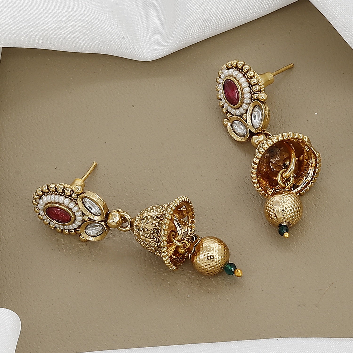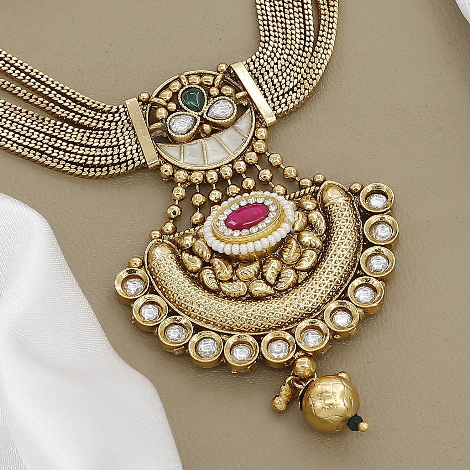 Gorgeous antique-finish necklace featuring multiple gold-tone chains and a beautiful ethnic pendant with pearl drops. Includes matching traditional Jhumka earrings. Essential jewelry for classic Indian styling.