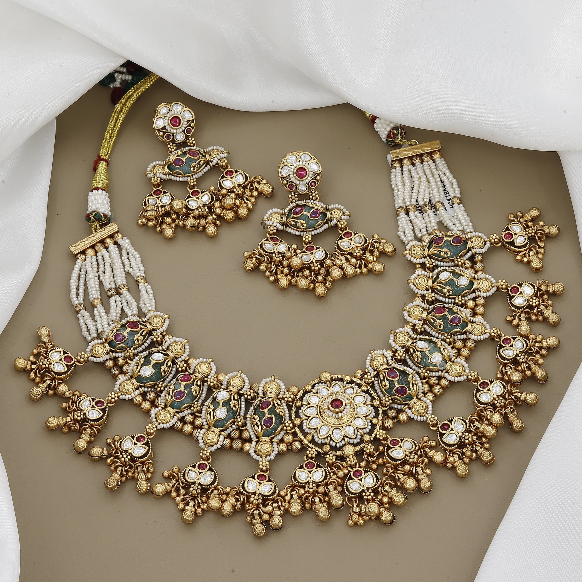 Elevate your festive look with this stunning gold-plated collar necklace set. The design features a series of linked medallions, each intricately embellished with sparkling kundan, deep red ruby-like stones, and vibrant green accents. The necklace is suspended from a multi-strand chain of lustrous pearls and beads, while dangling gold clusters add a touch of playful elegance.
