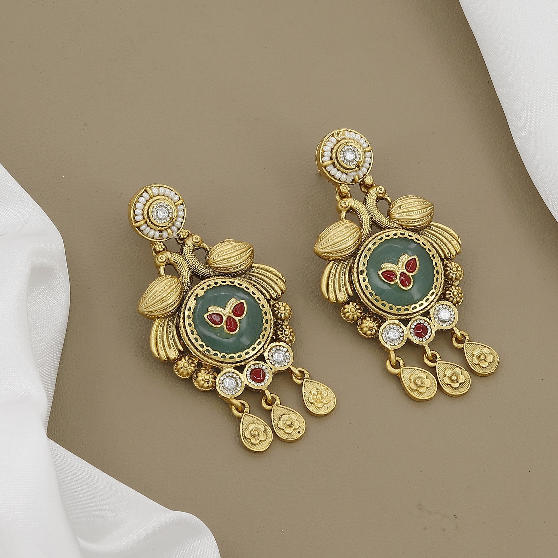 This exquisite gold-plated necklace and earring set features an intricate design with stunning peacock and floral motifs.