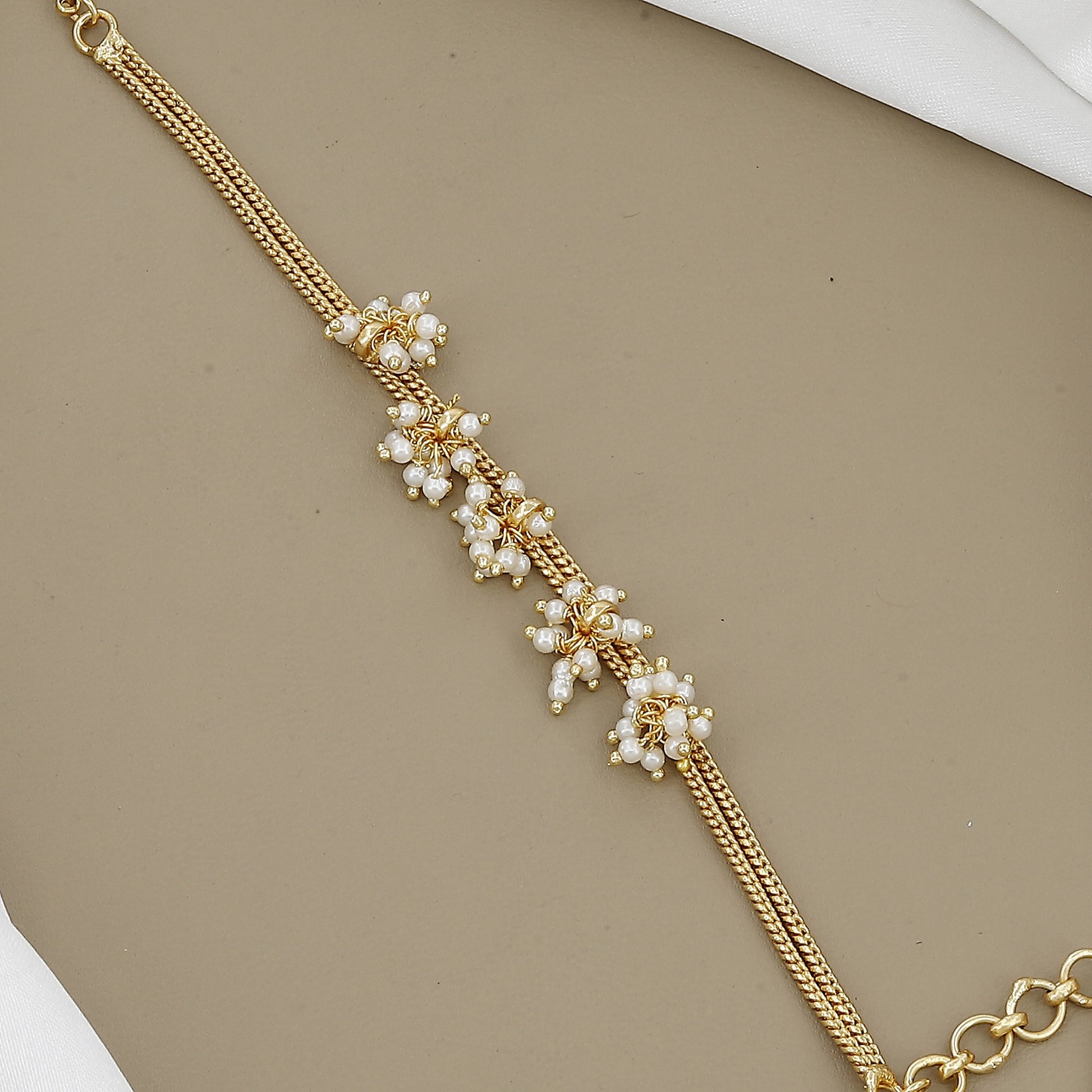 Adorn your wrist with our exquisite gold-toned bracelet, featuring delicate clusters of faux pearls. This elegant hand jewelry is perfect for adding a touch of classic charm to any outfit.