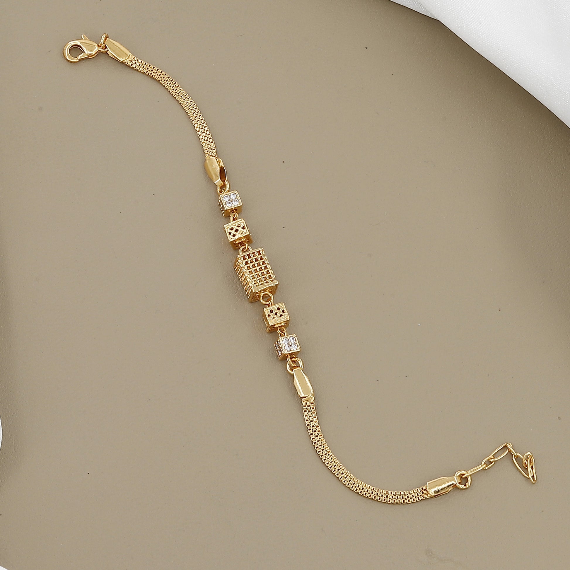 Add a touch of modern sophistication to your style with this Golden Lattice Cube Bracelet. This piece features a unique, intricate lattice cube at its center, flanked by sparkling stone-studded geometric links. The smooth, flat mesh chain provides a comfortable fit and a sleek look, making this bracelet the perfect accessory for both everyday wear and special occasions.