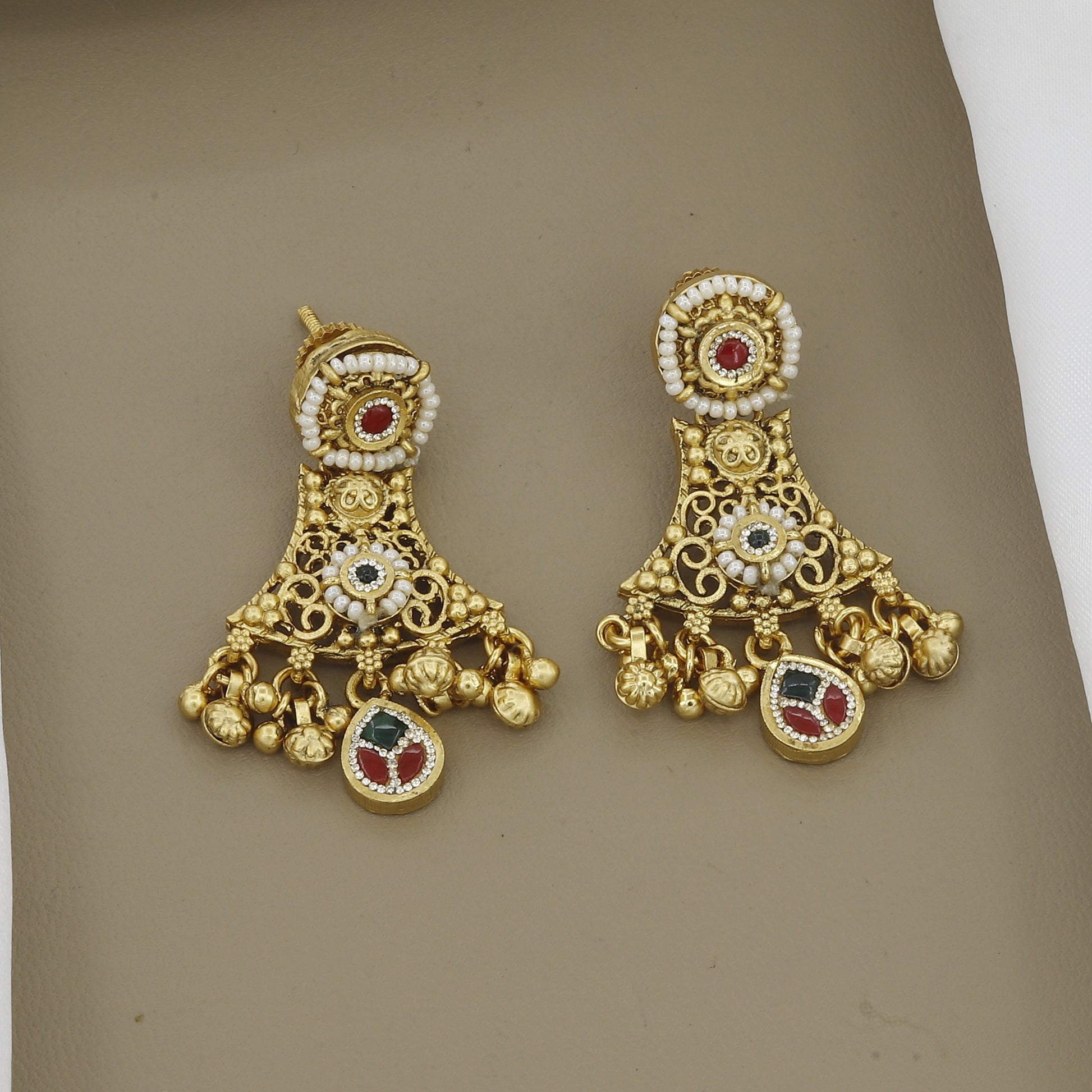 A magnificent gold-plated Mangalsutra and earring set featuring intricate Kemp stone work and a detailed peacock-floral design. Studded with ruby, emerald, and AD stones, this elaborate antique-finish jewelry is perfect for bridal wear or any opulent traditional event. Get the perfect statement look.