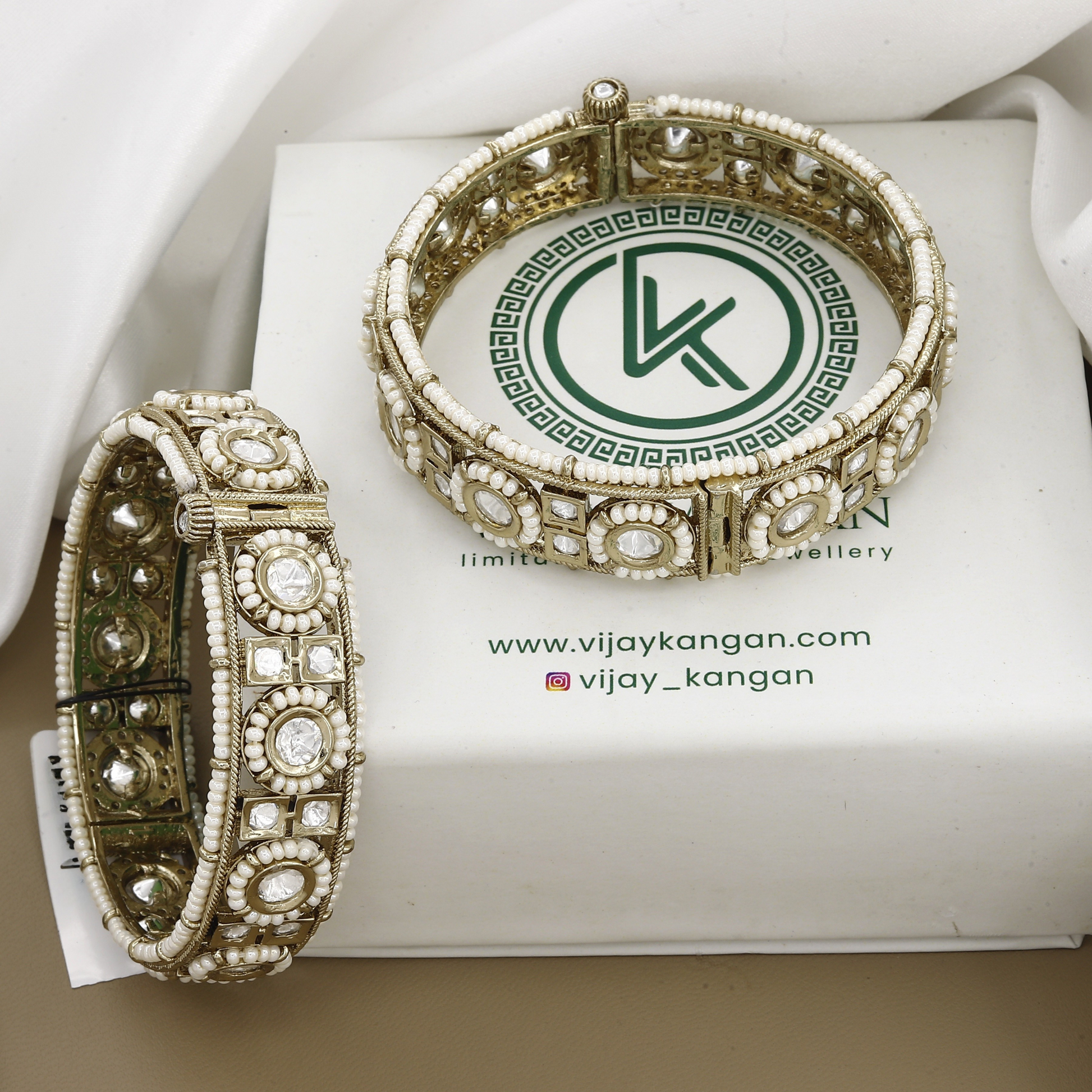 A true testament to timeless craftsmanship, these heirloom-quality patla bangles feature meticulously set Polki Kundan stones and delicate pearl beadwork. The antique finish adds a vintage charm, perfect for those who appreciate classic elegance.