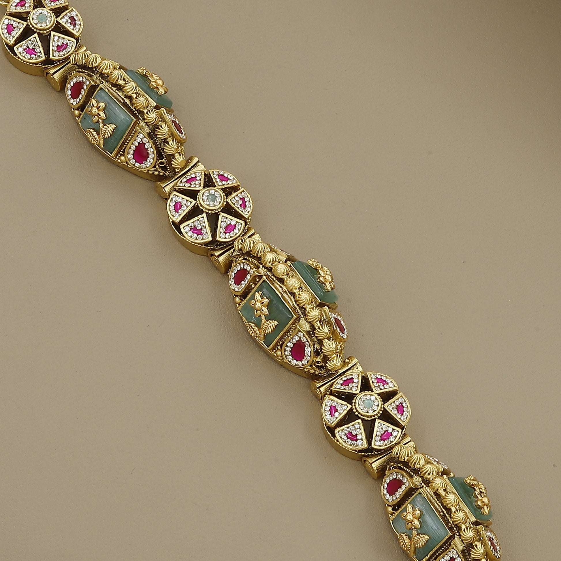 This stunning bracelet showcases a rich, traditional design, perfect for adding a touch of historical grandeur to any outfit. Its intricate construction and use of colorful stones make it a captivating piece of statement jewelry.