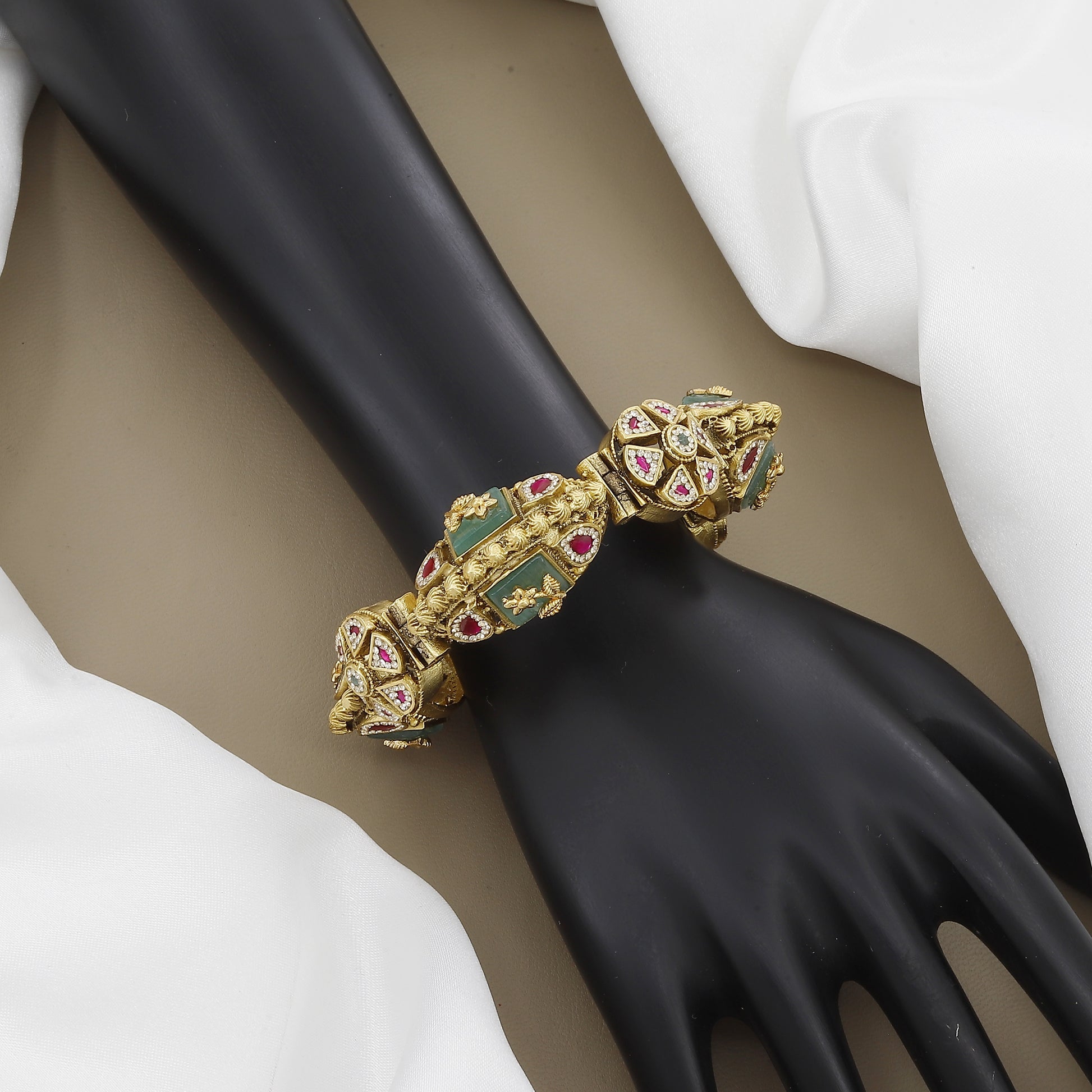 Heirloom Style Gold-Plated Bracelet with Carved Green Stone and Kundan