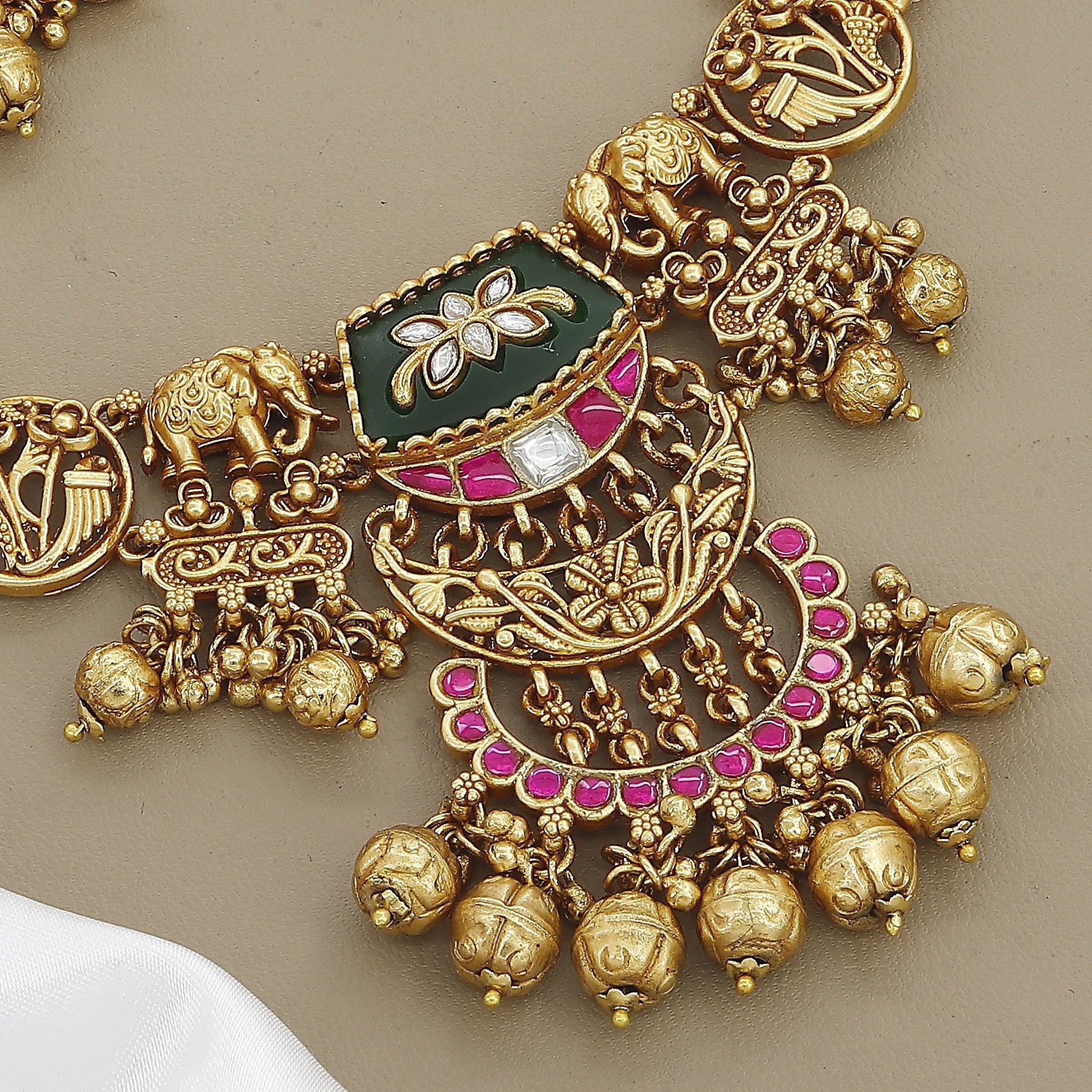 Gorgeous multi-strand pearl choker necklace set. The central enamel pendant and matching earrings are finished in a traditional gold-plated style. Perfect for festive occasions.