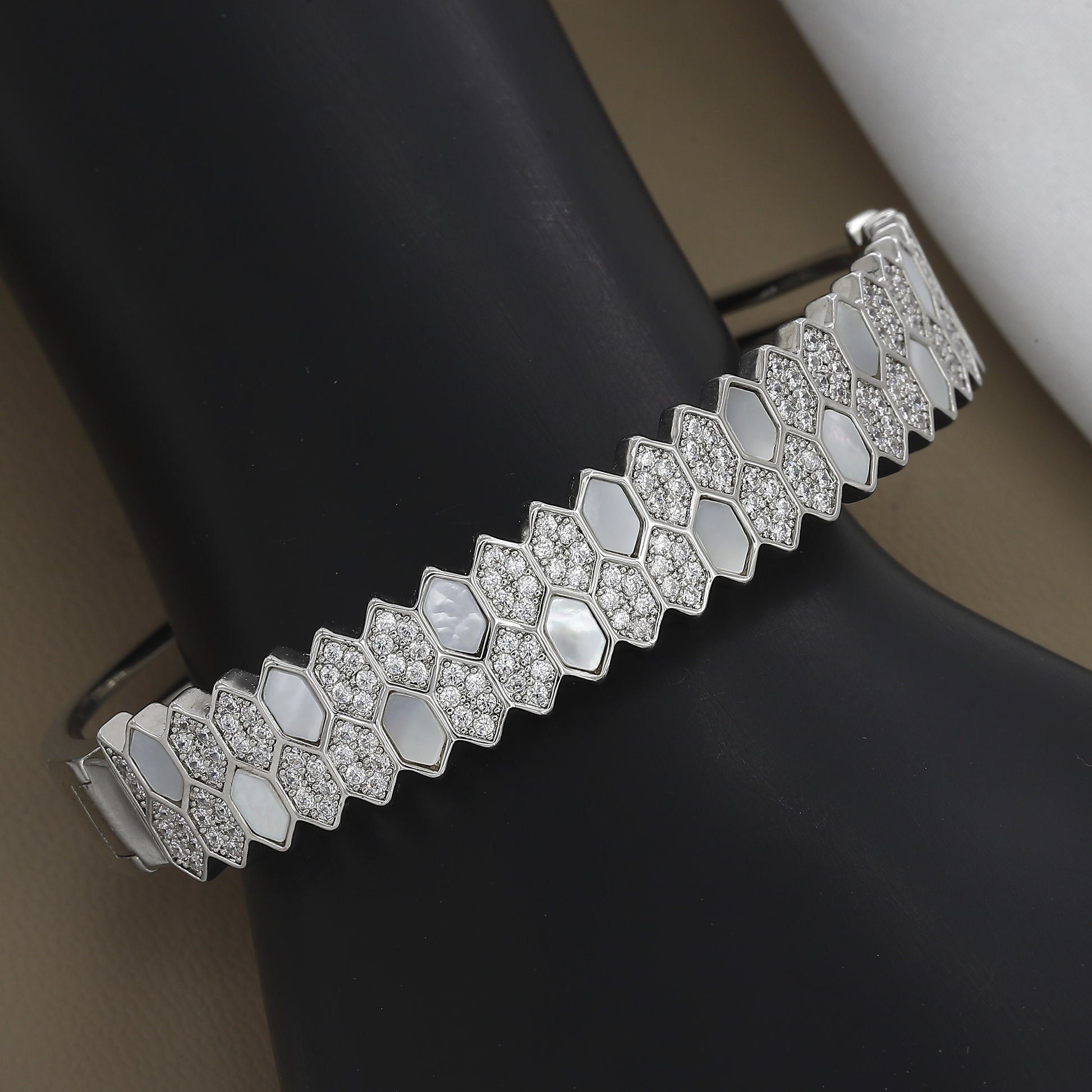 A truly unique silver-tone cuff with a modern, elegant hexagon pattern. This wide bangle alternates between luminous natural Mother of Pearl inlays and brilliant Cubic Zirconia (CZ) pave settings, creating a luxurious, textural statement piece