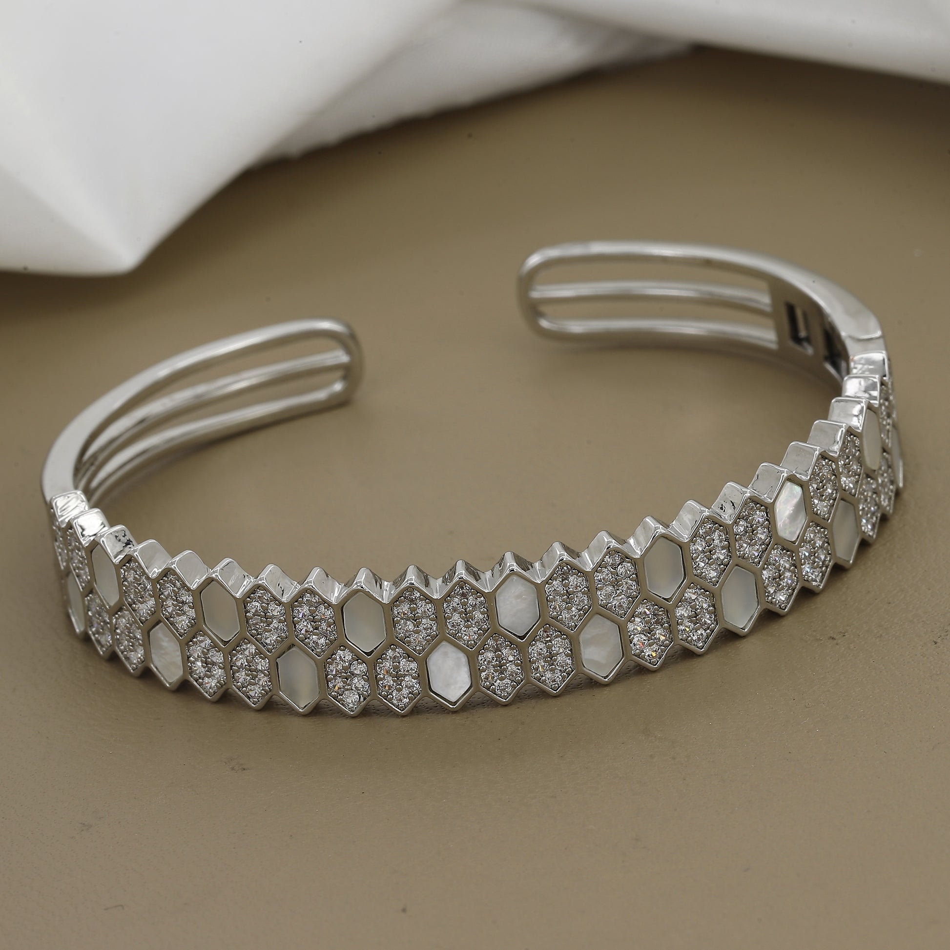 Mother of Pearl & CZ Pave Hexagon Cuff Diamond Bangle Kada