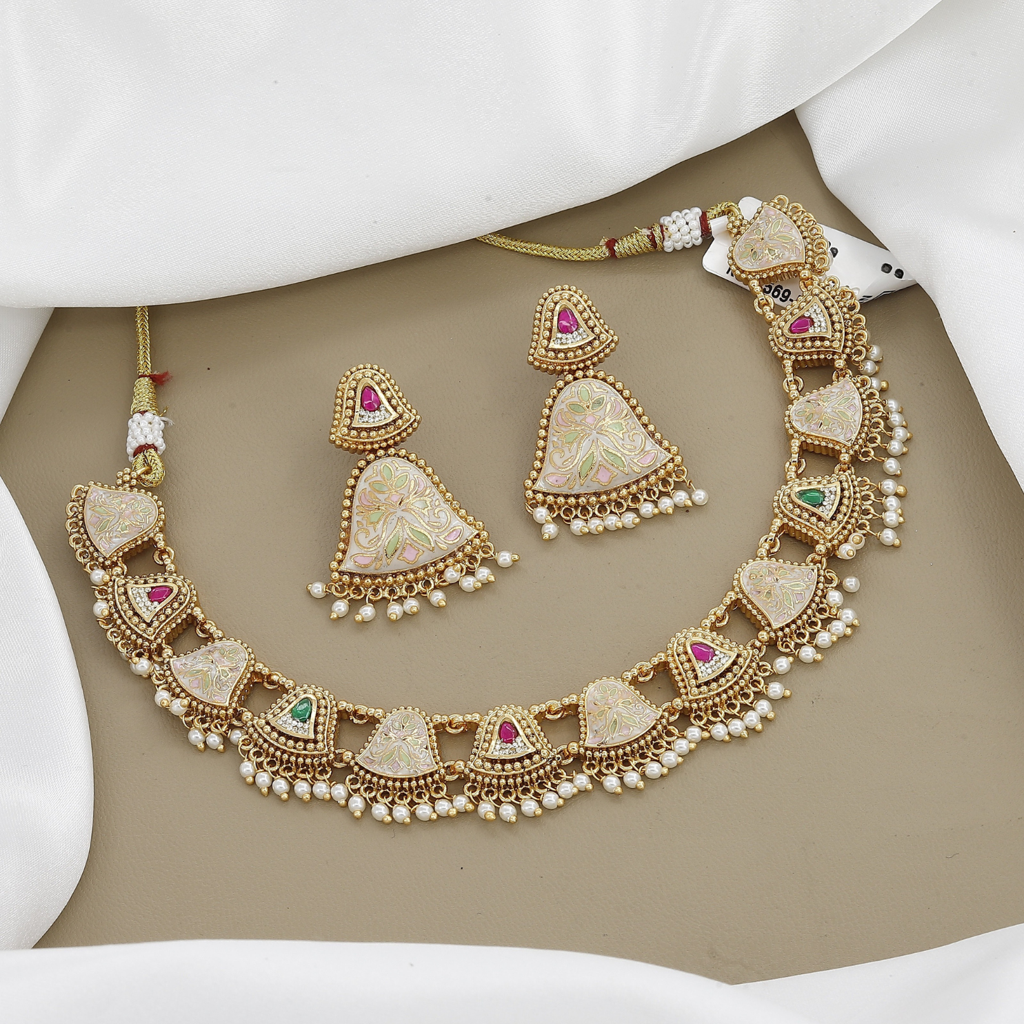 Shop our gorgeous matte gold-Toned Necklace set featuring delicate pink and white Meenakari enamel work and heart-shaped motifs. Comes with matching bell-shaped earrings.