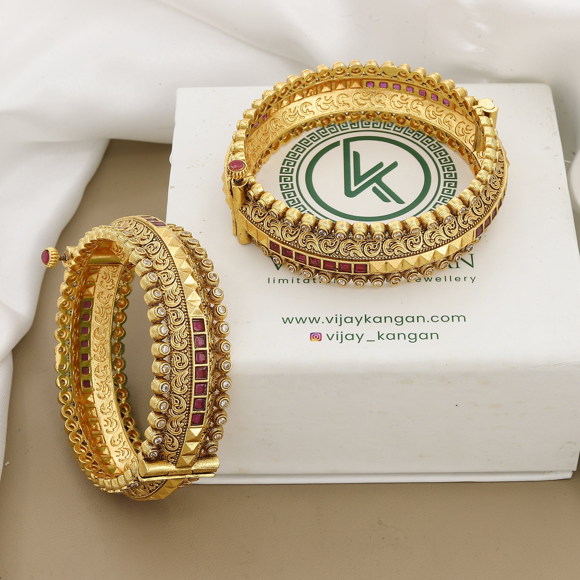Adorn your wrists with these stunning regal patla bangles. Featuring a bold design of deep ruby stones set against an intricate geometric pattern and accented with delicate white stones, these antique gold bangles are a luxurious statement piece for any bridal or festive occasion.