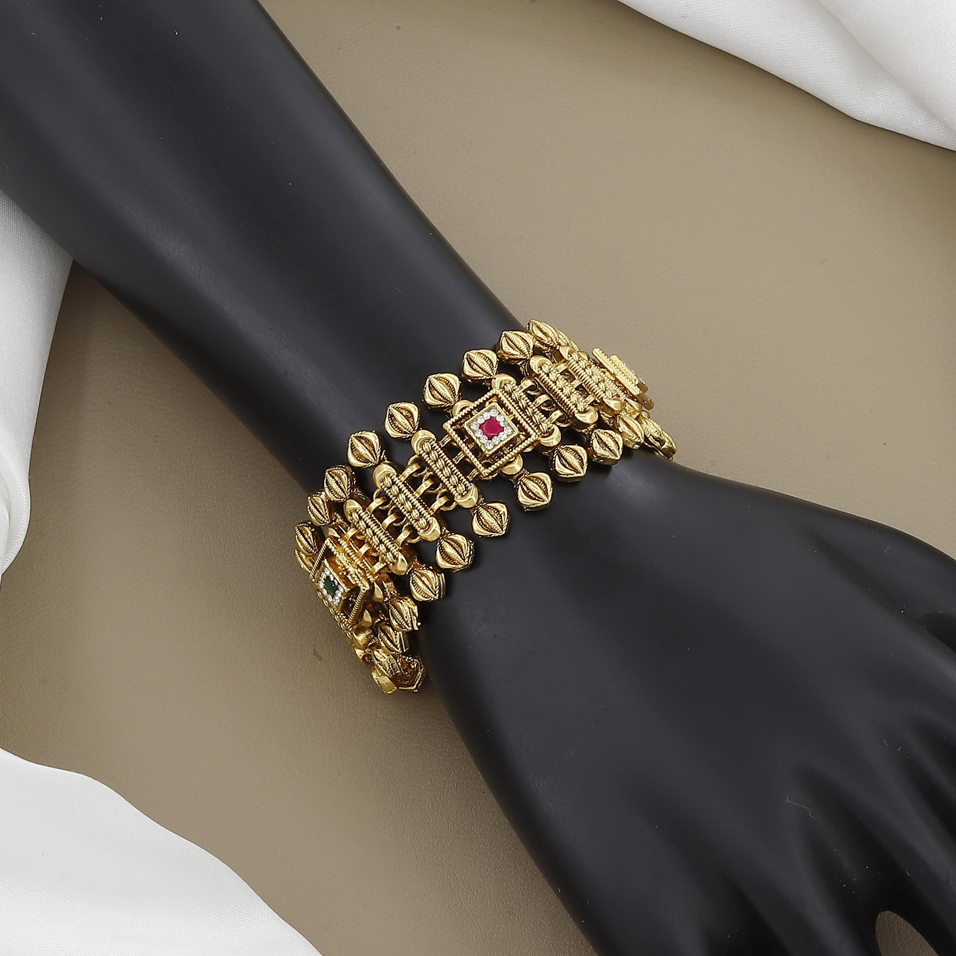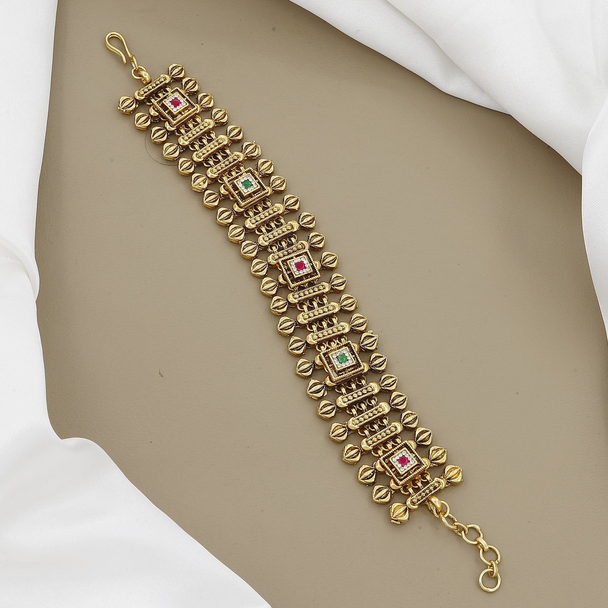 This elegant, antique gold-toned bracelet offers a beautiful blend of traditional texture and subtle color. It’s a versatile piece, perfect for adding a touch of vintage charm to both ethnic and contemporary outfits.