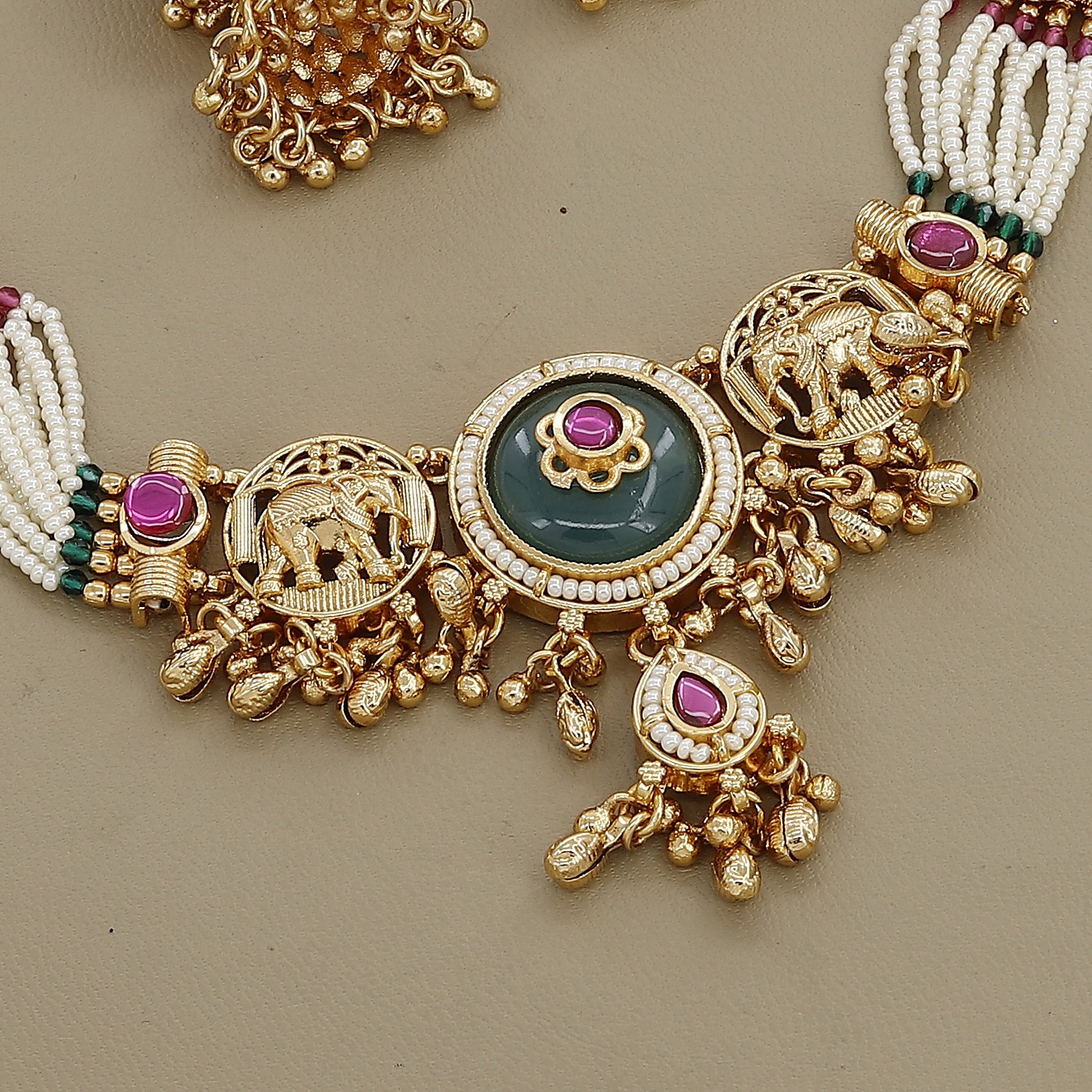 Shop this stunning heritage jewelry set featuring multi-strand white pearls, intricate elephant (gaja) motifs, and a gorgeous matte gold finish. Includes matching jhumka earrings.
