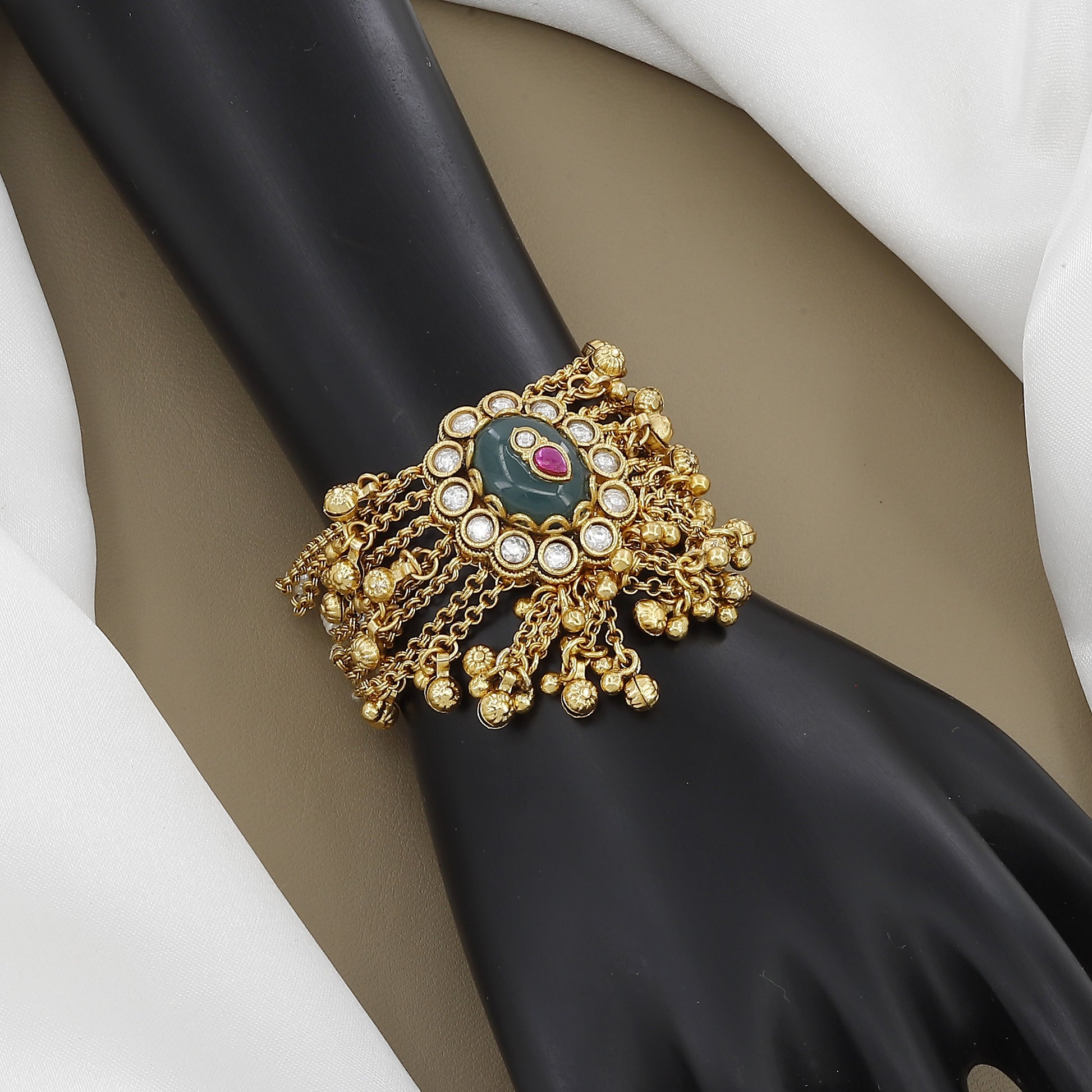 Adorn your wrist with this stunning Traditional Dangler Bracelet. It features a central gemstone medallion with Kundan work, surrounded by elegant gold chains and pearl strands.