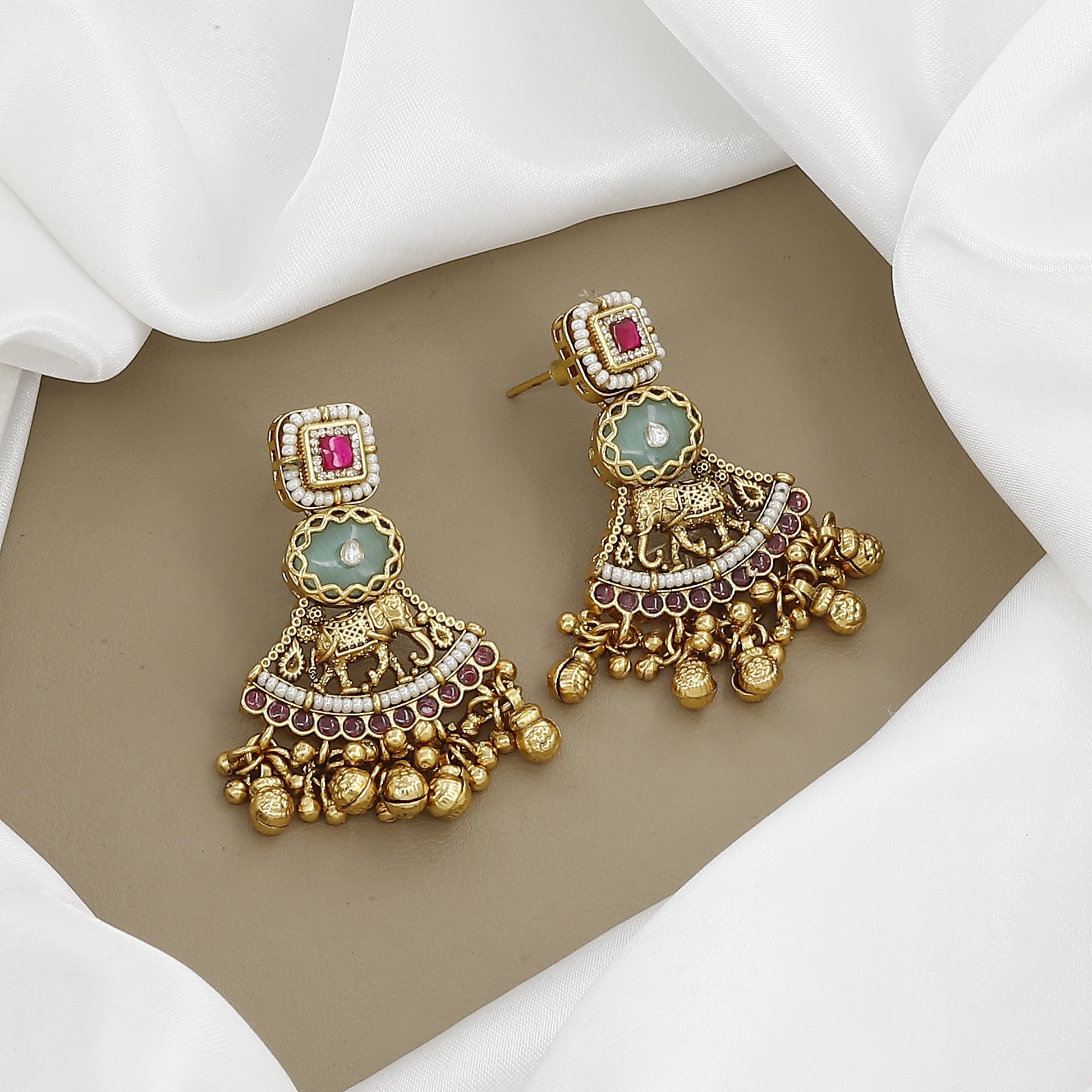 Shop this magnificent antique gold-plated choker set featuring intricate green Meenakari enamel and traditional elephant (Gaja) motifs. Includes matching heavy drop earrings. Perfect for weddings and grand occasions.