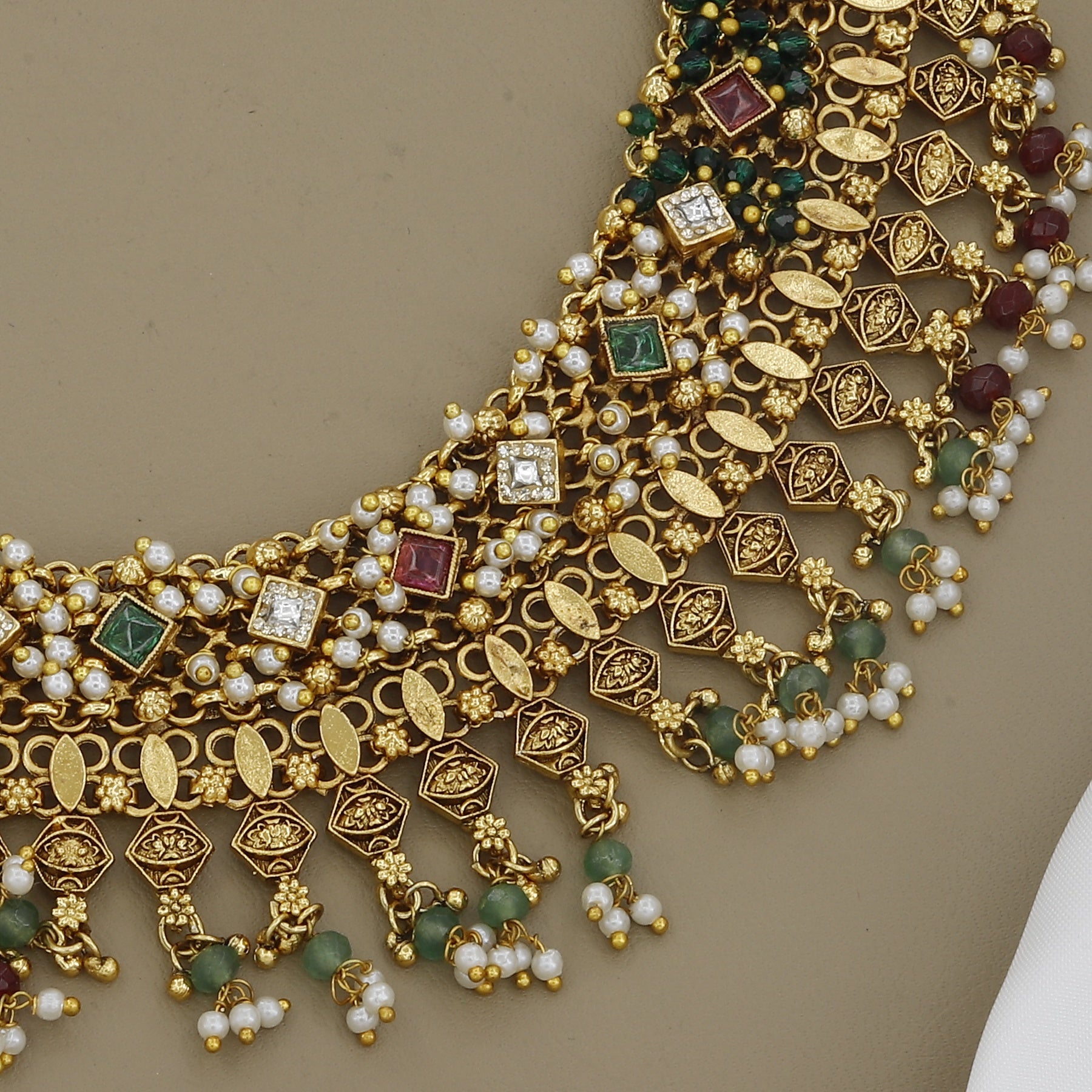 A versatile and elegant Kundan necklace set that's perfect for any occasion. This necklace showcases fine stone setting and is finished with clusters of ruby, emerald, and pearl drops. Includes comfortable, lightweight jhumka earrings.