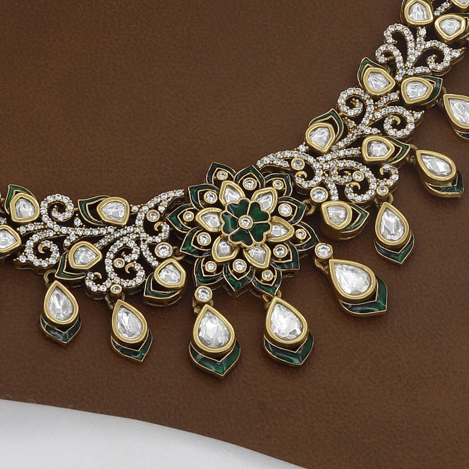 Victorian Polished Intricate Green Enamel & Kundan Polki Floral Necklace Set