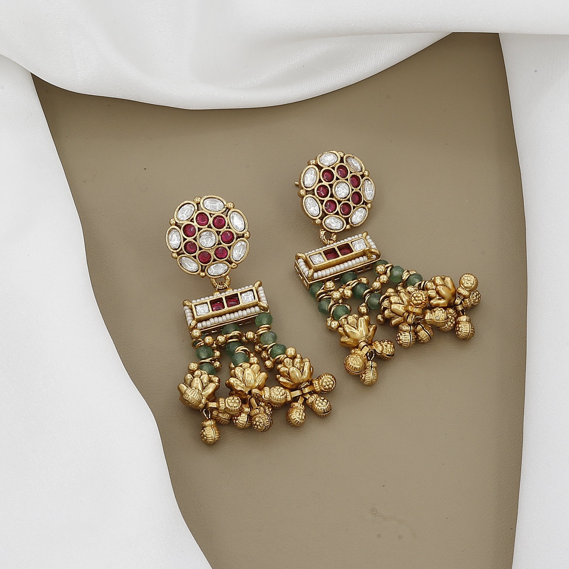 This vintage-inspired necklace set combines the rich heritage of Indian jewelry with a touch of modern design. The central gold-plated motif is adorned with intricate kundan work and deep red ruby-like stones, while the vibrant emerald-like beaded strands add a pop of color.
